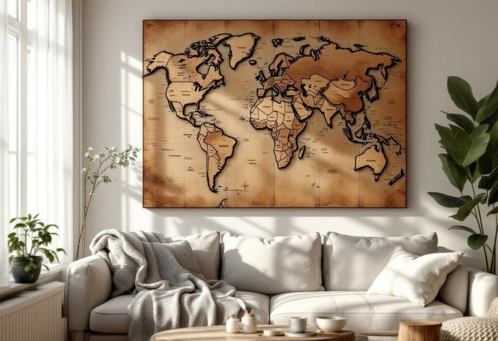 Que l’on vive dans un petit appartement urbain ou un loft spacieux, la variété des formats et des styles garantit une intégration réussie dans toutes les configurations. La carte du monde en bois personnalisée trouve sa place aussi bien dans un coin lecture discret que comme point focal d’un grand séjour.